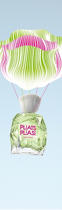 新鮮的青綠色給予人輕鬆和活潑樂觀的感覺,貫徹 Pleats Please色彩繽紛的世界。綠色象徵新生命或重生的感覺,色彩和香氣的完美配搭讓人不其然陶醉於快樂的環境當中。香氛標誌以紫粉紅色作對比,帶出活力、興高采烈的另一面。瓶盒上的花冠以兩色交替,略以鮮橙色加以點綴,將PLEATS PLEASE絢麗繽紛的歡樂層面彰顯出來。